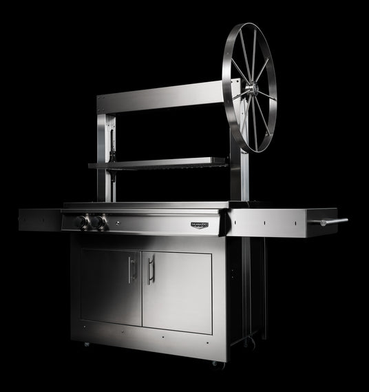 Un fuego de leña abierto, crepitando y humeando. Una parrilla de carne chisporroteando y caramelizando a la perfección, el calor del fuego vivo imparte sabores que no se pueden conseguir en interiores. Tienes el control total: el encendedor de gas enciende la madera de manera confiable, la rueda se mueve sin esfuerzo, el asador motorizado, lo suficientemente grande para un animal entero, gira silenciosamente. Cuando el fuego es fuerte y caliente, y te atrae el olor a humo y carne cocinándose, todo lo que sientes es el poder de la parrilla al estilo argentino. Descubre la antigua tradición de la barbacoa argentina.