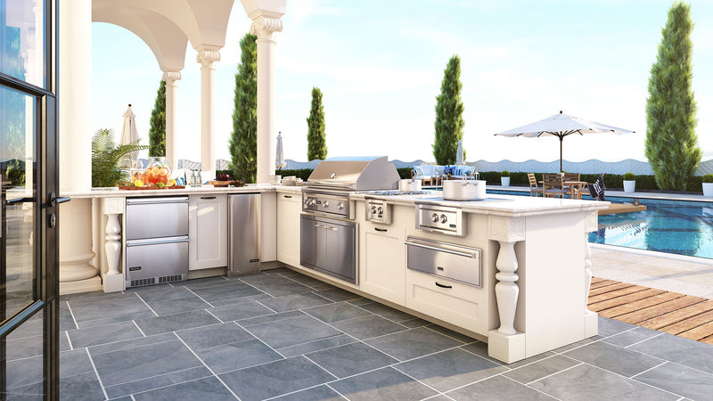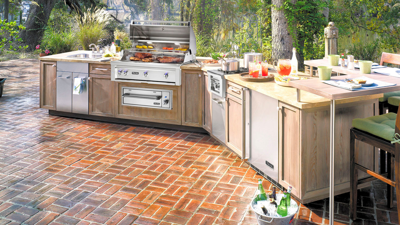 Los productos Viking Outdoor ofrecen todo lo que esperarías encontrar en una cocina, excepto las paredes. Por supuesto, nuestras parrillas a gas de alta resistencia son lo máximo en barbacoas, pero te sorprenderá encontrar productos como cajones calentadores, refrigeradores bajo encimera e incluso campanas extractoras en el patio trasero. A la Madre Naturaleza también le gusta entretener.