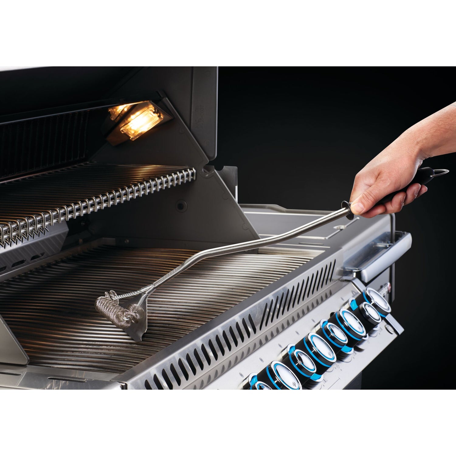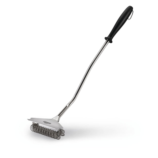 Mantenga limpias sus rejillas de acero inoxidable con este cepillo para parrilla ancho de acero inoxidable que incluye un diseño extra ancho y un raspador de rejilla. El diseño de la manija curva agrega más presión para frotar y el gancho integrado hace que su cepillo para parrilla esté siempre al alcance de la mano.