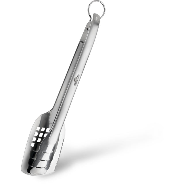 La herramienta para su parrilla sin la cual no puede vivir. La espátula-pinza de acero inoxidable de Napoleon es una herramienta 2 en 1 para la parrilla, hecha de acero inoxidable duradero que se puede lavar en lavavajillas. Use la espátula para fácilmente manipular alimentos más grandes como filetes y hamburguesas. El lado plano de la espátula también tiene un borde biselado para colocarla debajo de la comida que se está cocinando, y un borde cortador que proporciona porciones perfectas después de que se hace la comida. Manejar cosas más delicadas con la ayuda de las tenacillas es fácil. Use las tenacillas para estabilizar los alimentos, como el pescado o un filete gigante, cuando los voltee para sellarlos perfectamente. El mecanismo con resorte proporciona estabilidad y control, mientras la manija con traba fácil de usar brinda gran almacenaje compacto y un gancho conveniente.