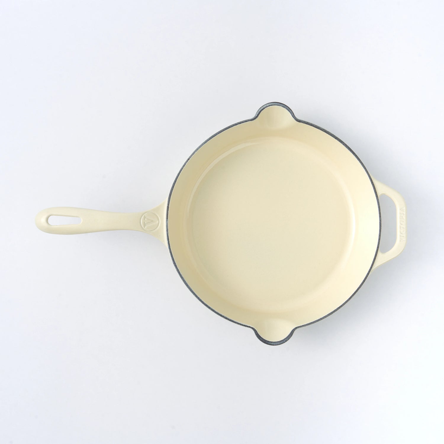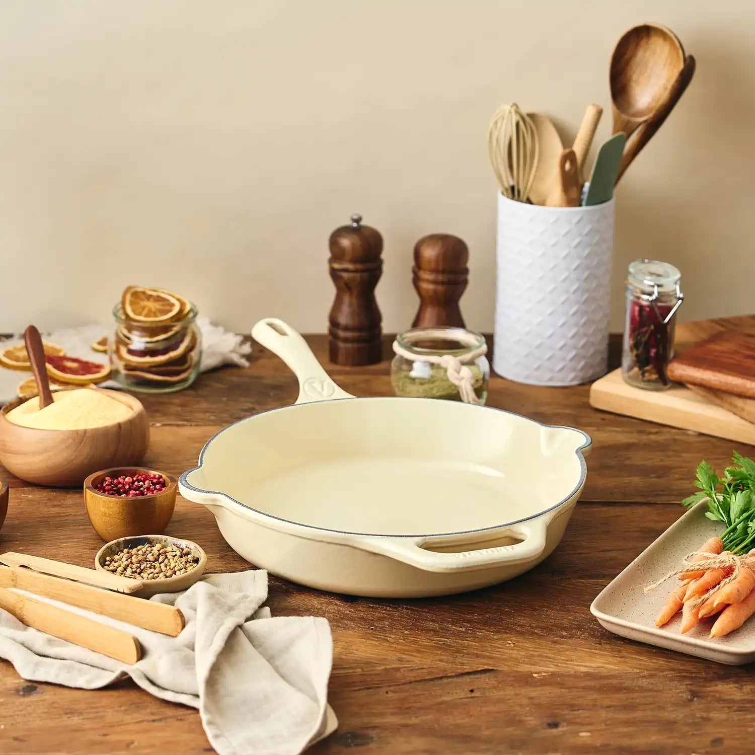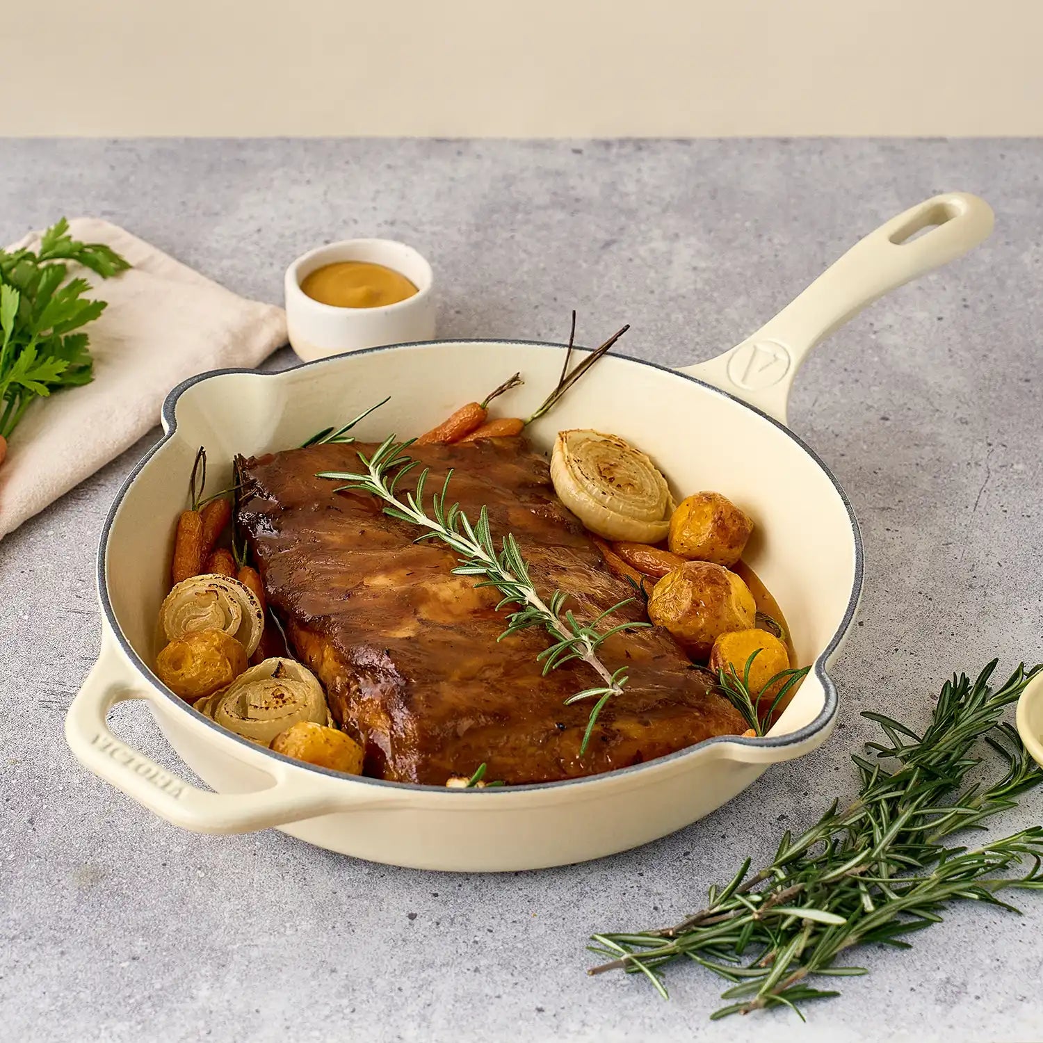 Descubre el sartén de hierro fundido de 28 cm de la colección Sable, su diseño ergonómico, con un mango curvo y un asa de apoyo, garantiza una manipulación cómoda, incluso al preparar generosas cenas familiares.