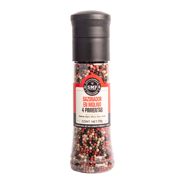 Nuevo Molino Mezcla de la Casa de 4 Pimientas. Al contener granos enteros de pimienta, tendrá un sabor más fresco y profundo en tus preparaciones. Esta mezcla de ingredientes lo hace ideal para todo tipo de corte de carne, entero o en piezas, para vinagretas y verduras.